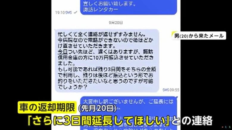 レンタカー店は今も男が代金の11万円を支払っておらず、連絡もつかなくなっていると話す。