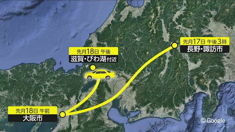 その翌日の18日、オープンカーに取り付けていたGPS(衛星利用測位システム)で位置情報を確認したところ、車があったのは長野からおよそ280km離れた大阪駅付近の駐車場だった。さらにその後、滋賀県の琵琶湖周辺へと移動した。