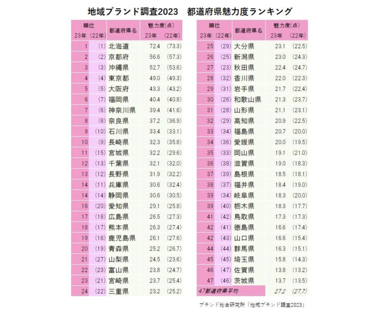 都道府県魅力度ランキング、茨城が再び最下位に 2023/10/16 バイク速報 民間調査会社「ブランド総合研究所」(東京)は14日、2023年版「都道府県魅力度ランキング」で、茨城県が最下位になったと発表した。昨年の調査で最下位だった佐賀県は46位となり、順位が入れ替わった。1位は15年連続で北海道。2位は京都府、3位は沖縄県だった。 https://www.jiji.com/jc/article?k=2023101400550&g=soc 続きを読む Source: バイク速報
