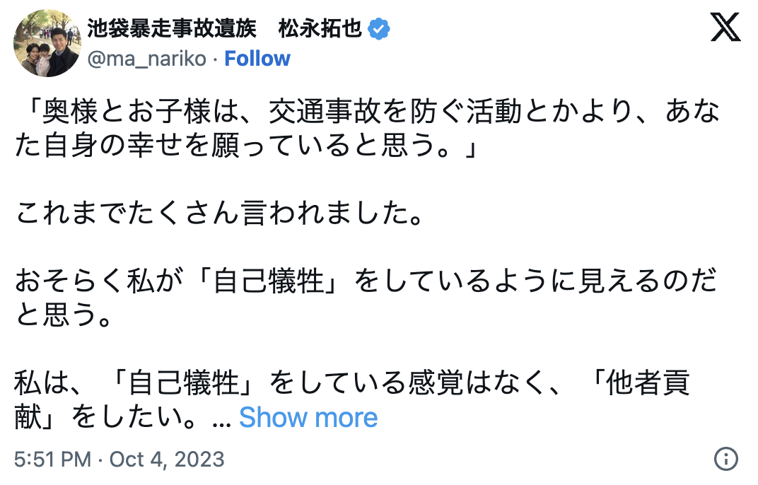 池袋暴走事故の遺族松永さん、自分が自己犠牲してると勘違いされた気がしたので釈明する