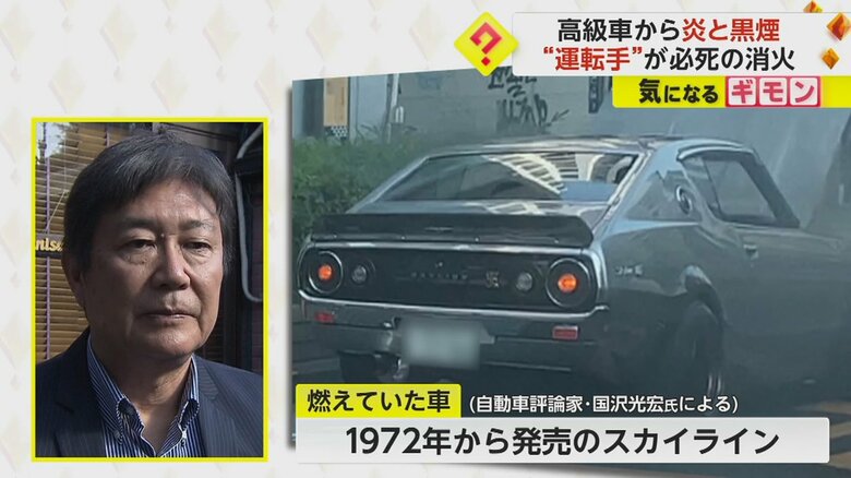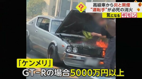 自動車評論家の国沢光宏さんによると、この車は1972年から発売のスカイラインだ。「ケンメリ」の愛称で親しまれていて、GT-Rというモデルの場合、5000万円は下らないという。火は30分ほどでほぼ消し止められ、けが人はいないという。