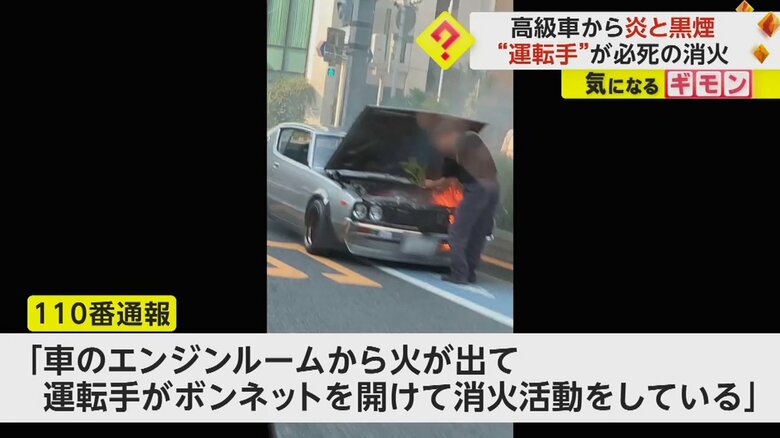 撮影された車のエンジンからは、真っ赤な炎が噴き出している。車の前では、運転手とみられる男性がタオルのようなもので、必死に火を消そうとする様子が確認できた。車両火災を目撃した人からは、「昔の車だ」という声が上がっていた。