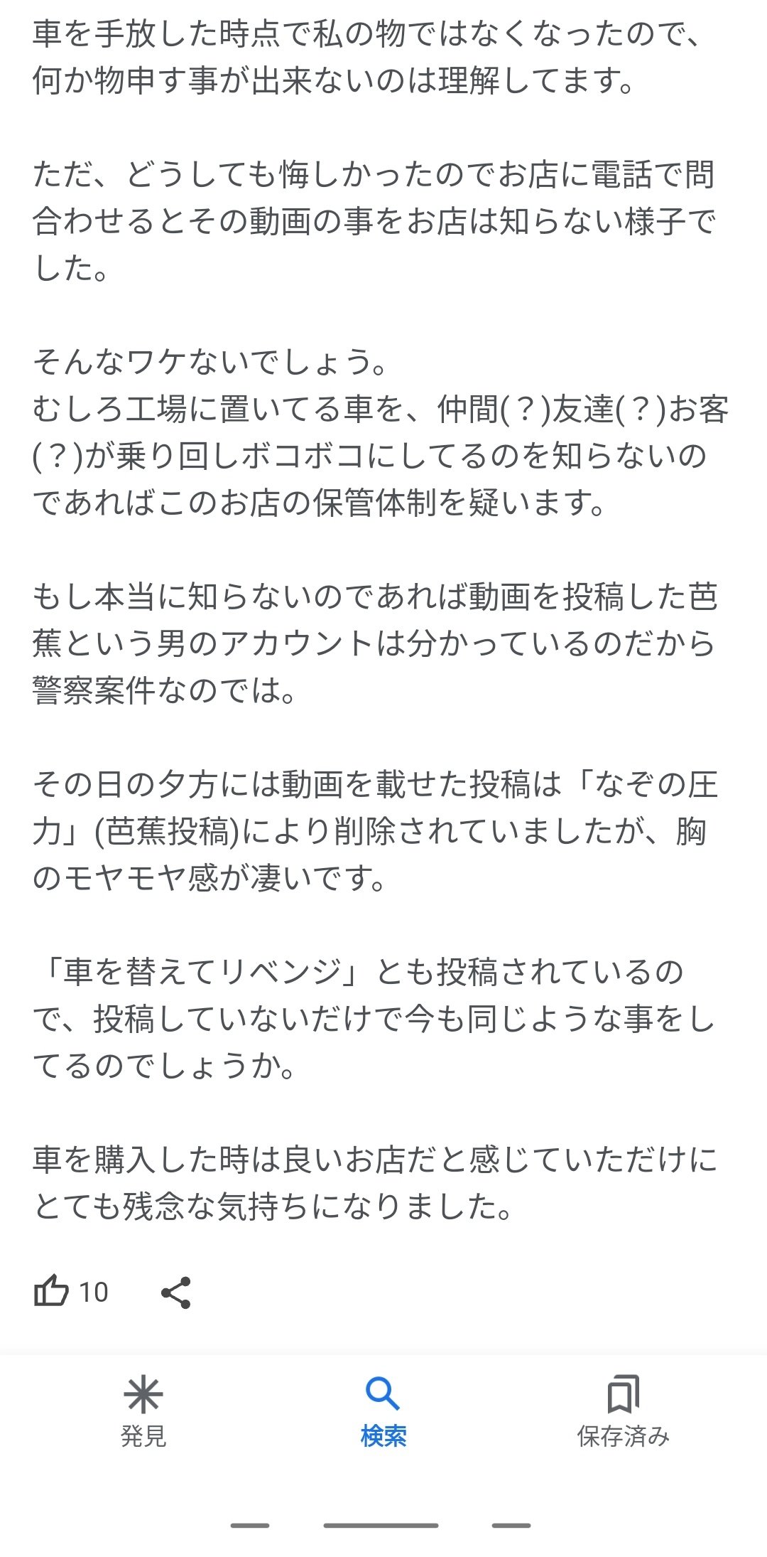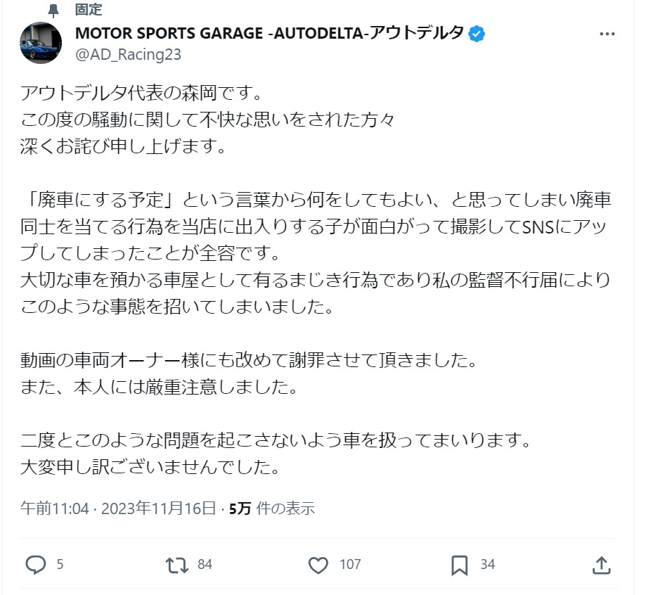 深くお詫び申し上げます。「廃車にする予定」という言葉から何をしてもよい、と思ってしまい廃車同士を当てる行為を当店に出入りする子が面白がって撮影してSNSにアップしてしまったことが全容です。…