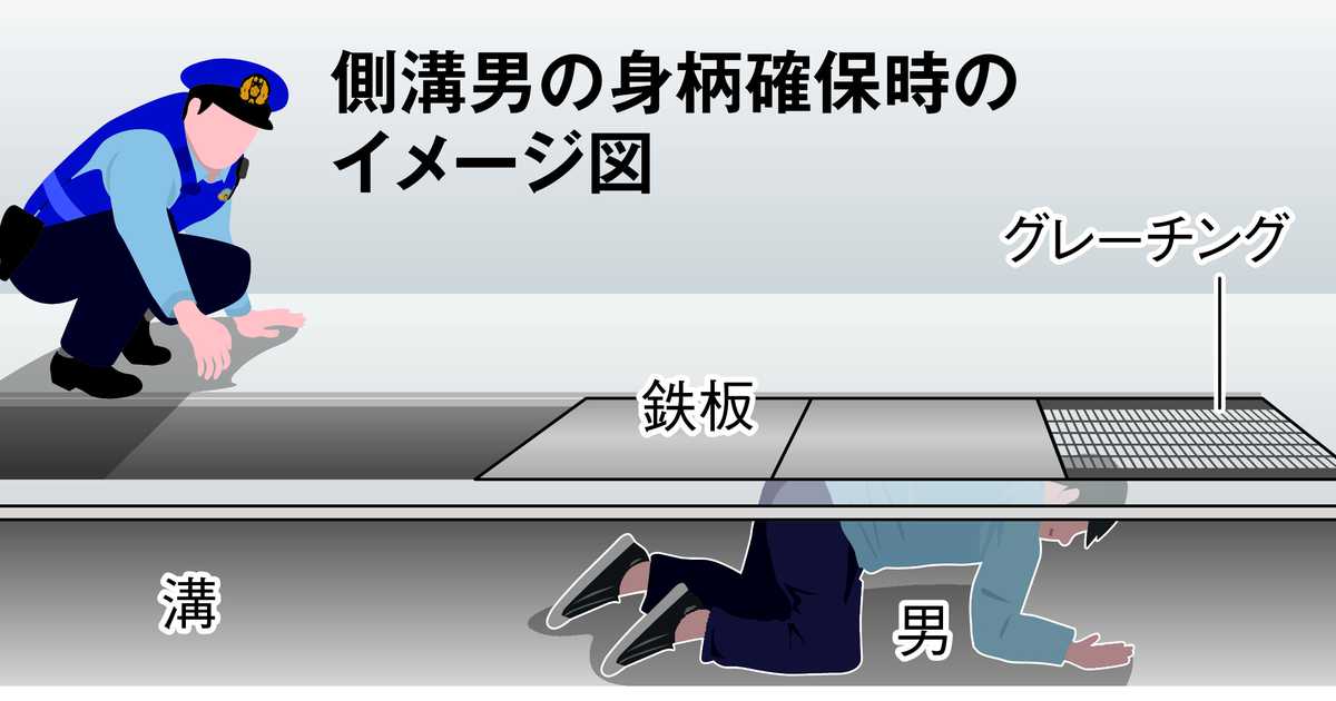 9月14日夕、学生らが行き交う神戸市東灘区内の路上脇の側溝内で息を潜める男。上方からグレーチング越しに側溝を確認する捜査員と目が合った。実際は、そのとき男の存在に気付いてなかったが、違和感を覚えた捜査員が数メートル後方の鉄板のない場所から側溝内をのぞきこむと、四つんばいであとずさりしながら逃走を図る男の尻が見えた。