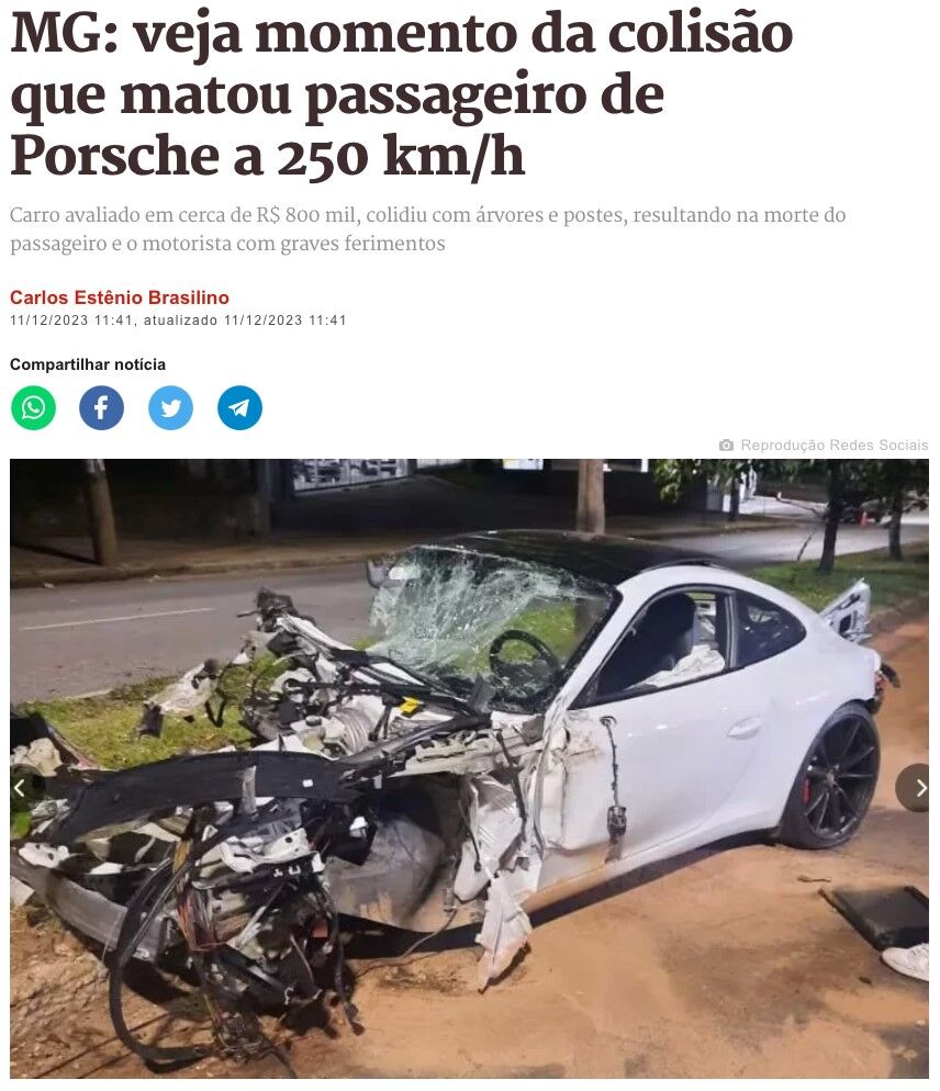 ミナス・ジェライス州の州都ベロオリゾンテ市西部のバロン・オーメン・デ・メロ大通りで10日未明、高級車ポルシェの横転事故が発生し、同乗していた男性1人が死亡した。運転手のロドリゴ・ロドリゲス・アンドラーデ・シアッティ容疑者(32)が過失致死罪で起訴された。無免許の上、飲酒運転の疑いもあると、11日付テラ・サイトなどが報じている。