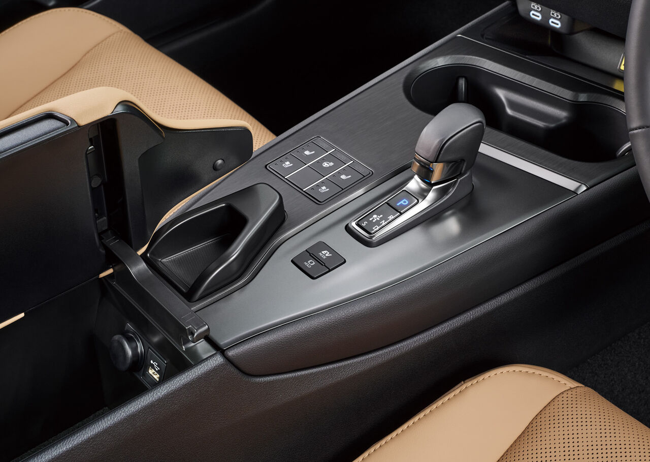 シフトレバーは、シフトポジションを電動で制御するエレクトロシフトマチックを採用。ショートストロークにより、小気味よく、確実で素早いシフト操作を実現。また、センタコンソールパネル、シフトパネル、フロントトレイ、パワーウィンドウスイッチベースには、金属感があり光の当たり方によって面の表情が変わる色を新たに採用し、電動車としてのシンプルかつクリーンさに、上質さや華やかさを併せ持つ内装とした(写真はUX300h “version L” センターコンソール)