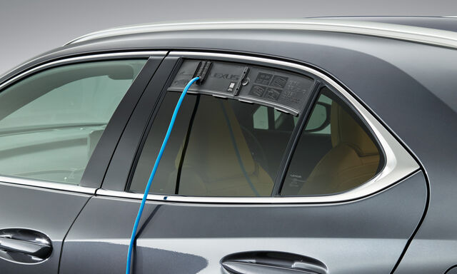 車内のアクセサリーコンセント(AC100V 1500W/非常時給電システム付)を新たに設定。停電などの非常時に、車内や車外において消費電力で計1500W以下の電気製品を使用可能。また、外部給電アタッチメントを利用することで、窓を閉めたまま電源コードを出して給電が可能。車内への虫などの異物の侵入や、雨天時の水の侵入を低減することができる(写真はUX300e、外部給電アタッチメント)
