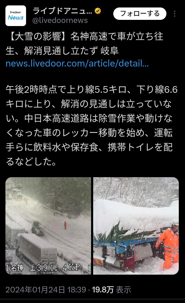関ヶ原インターから500メートル先(390.3ポスト付近)で朝9:30から缶詰くらってる…最悪2泊3日は覚悟しなきゃだな😫 pic.twitter.com/uEP2TKy4PE— MOTRA GARAGE【SSTR2023.5.27完走 ♯7333】 (@motra_garage) January 24, 2024