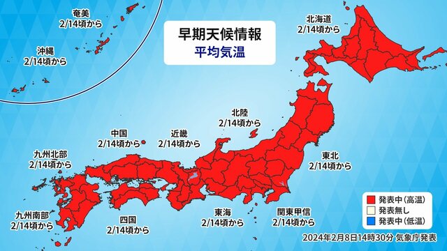 この情報は、その地域・その時期にとっては、10年に一度程度しか起きないような著しい高温や低温、降雪量が予想された場合に6日前までに発表される情報です。