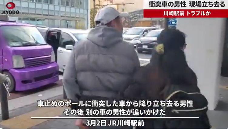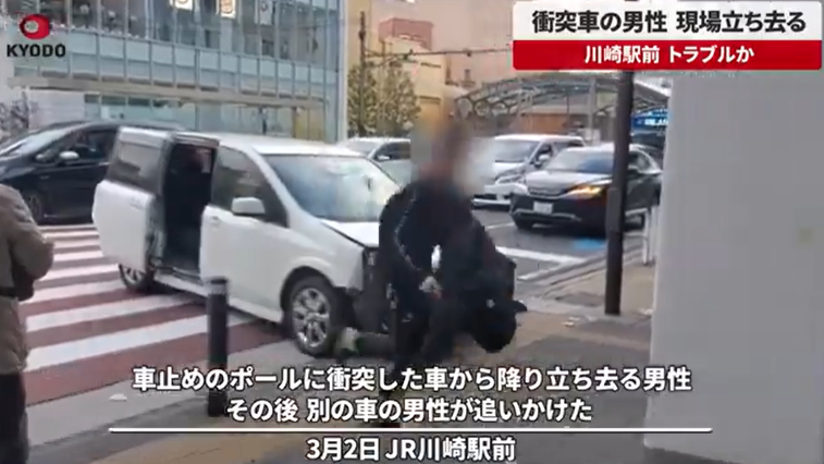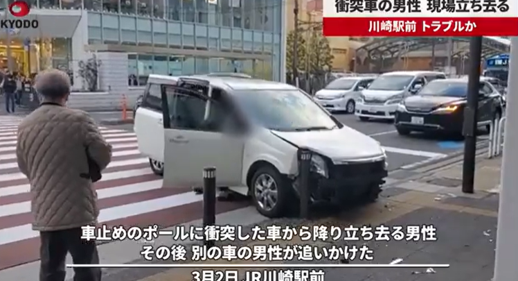 2日午後4時55分ごろ、川崎市川崎区のJR川崎駅近くの横断歩道で「ポールに乗用車が突っ込んでいる」と110番があった。神奈川県警川崎署によると、けが人は確認されていない。共同通信記者が撮影した映像によると、白い車が車道と歩道の間に設置された車止めのポールに衝突し、右前部が破損した。車から男性が降り、所持品を持って現場を立ち去った。その直後、別の車が横断歩道上に止まり、運転席から降りた男性が声を上げながら後を追いかけた。署によると、何らかのトラブルがあったとみて当時の状況を調べている