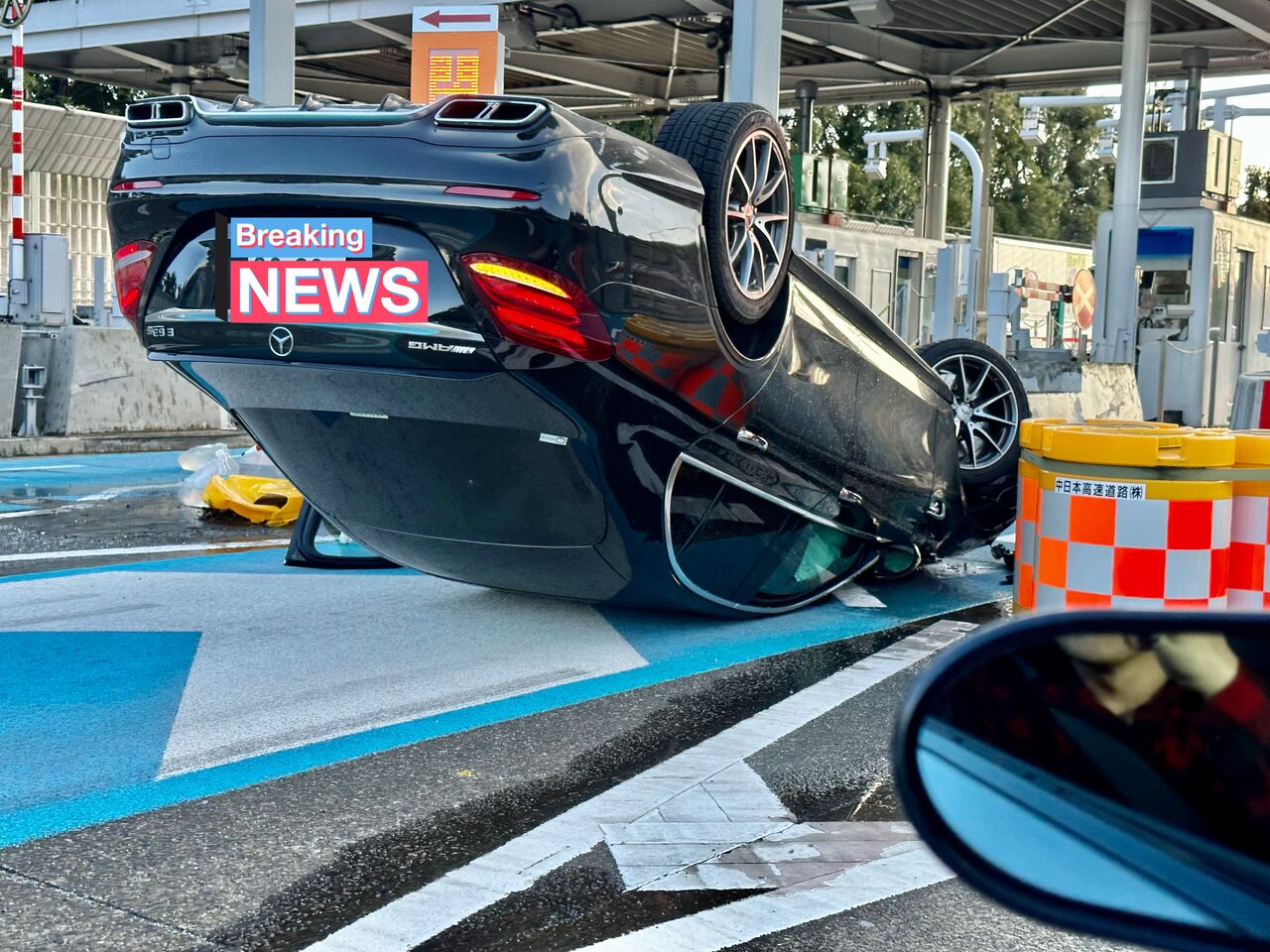 【画像】中央道 三鷹料金所でベンツがひっくり返る