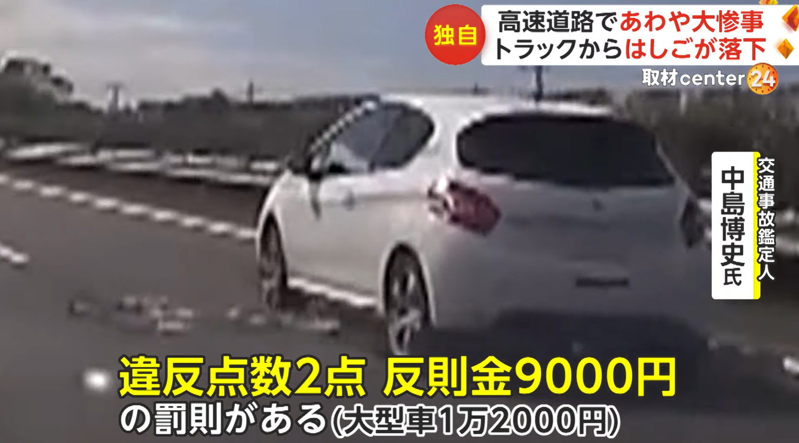 交通事故鑑定人・中島博史氏「高速道路で物を落とした場合、違反点数2点、反則金9000円の罰則がある。(大型車1万2000円)逃げてしまうと、さらに重い罪になる可能性がある。速やかに通報し、処置を待ってください」