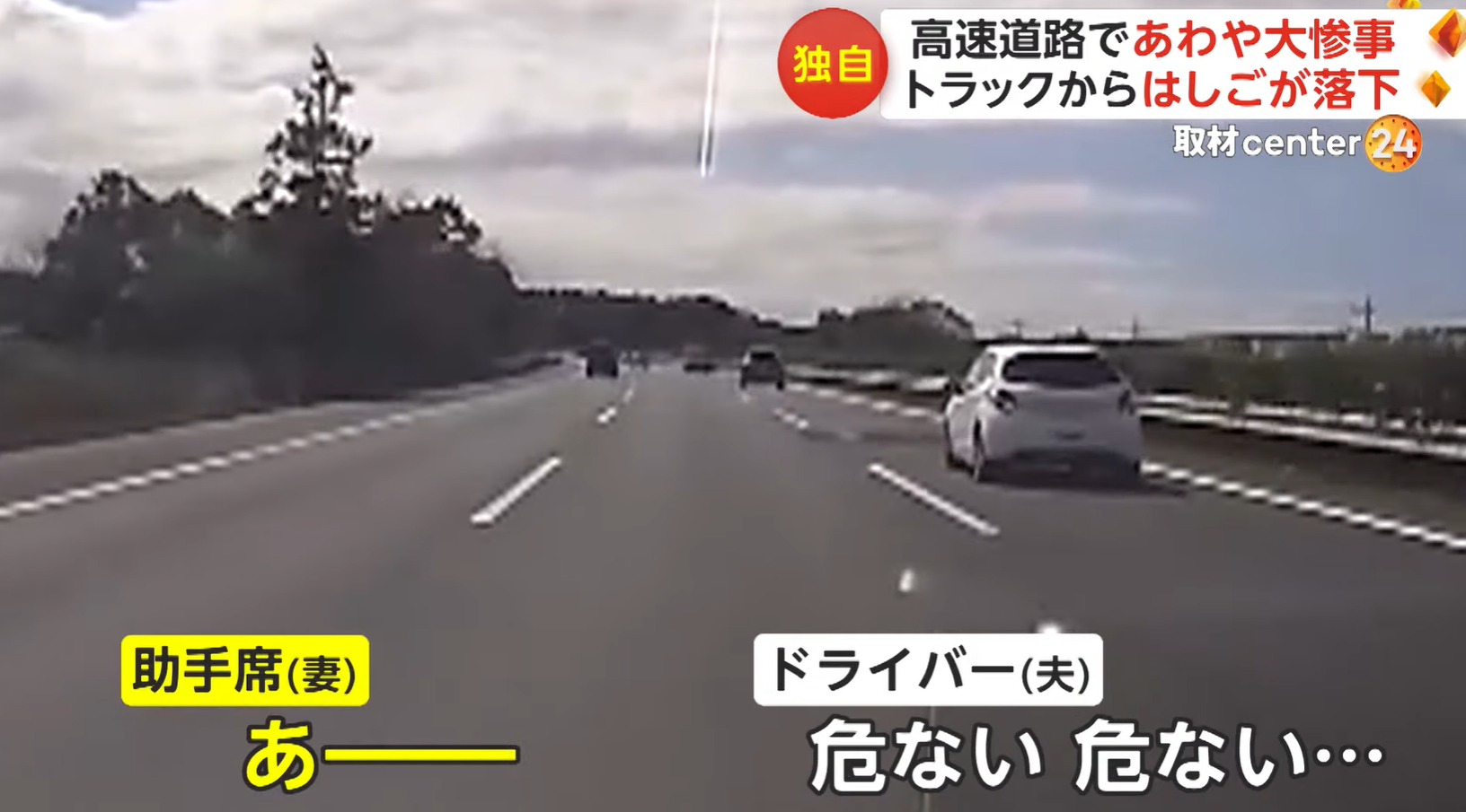 助手席にいた妻「風が強かった日だった。しっかりはしごを(落ちないように)とめてもらいたい。(後続車が左に)よけていたらぶつかっていた。多分、大事故になってたのかな…」