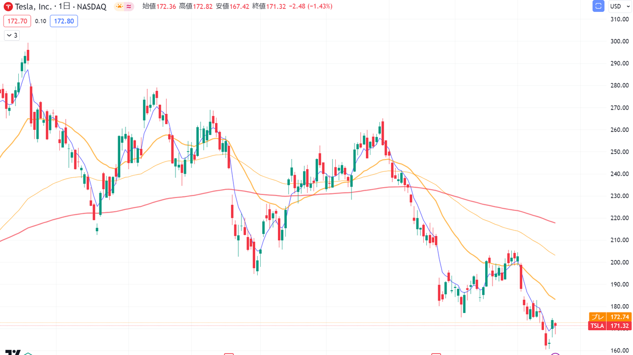 世界的なEV市場の減速懸念などを背景に、2023年夏に付けた直近のピークから5割弱も下落した。一時期は半導体大手エヌビディアなどとともに米相場をけん引する「マグニフィセント・セブン(壮大な7社)」と呼ばれたが、その称号を失いつつある。