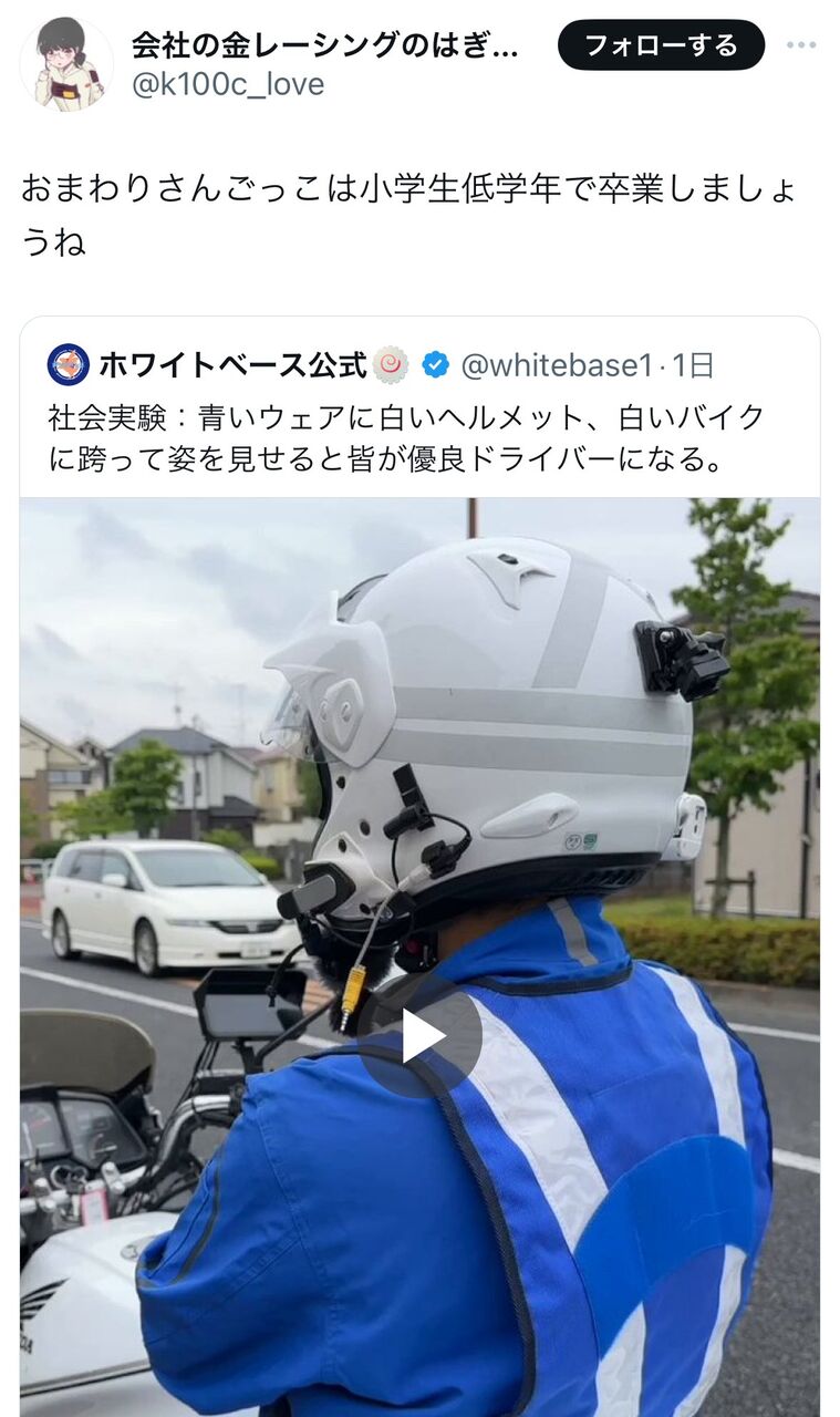 社会実験:青いウェアに白いヘルメット、白いバイクに跨って姿を見せると皆が優良ドライバーになる。 pic.twitter.com/oZyR6tIb06