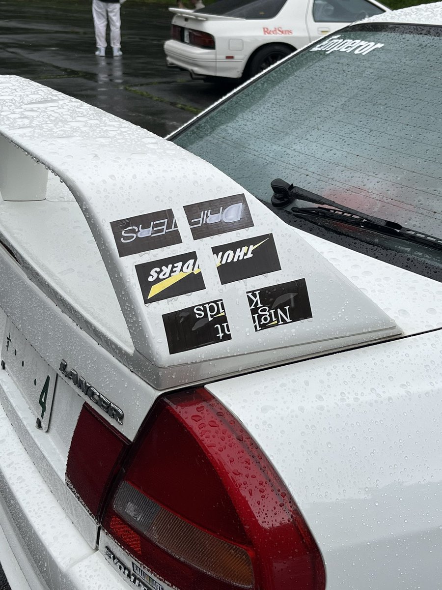 そして、相手チームのステッカーを二つに切り分け逆さまにし、撃墜マークのようにリアウイングに貼り付けていた。