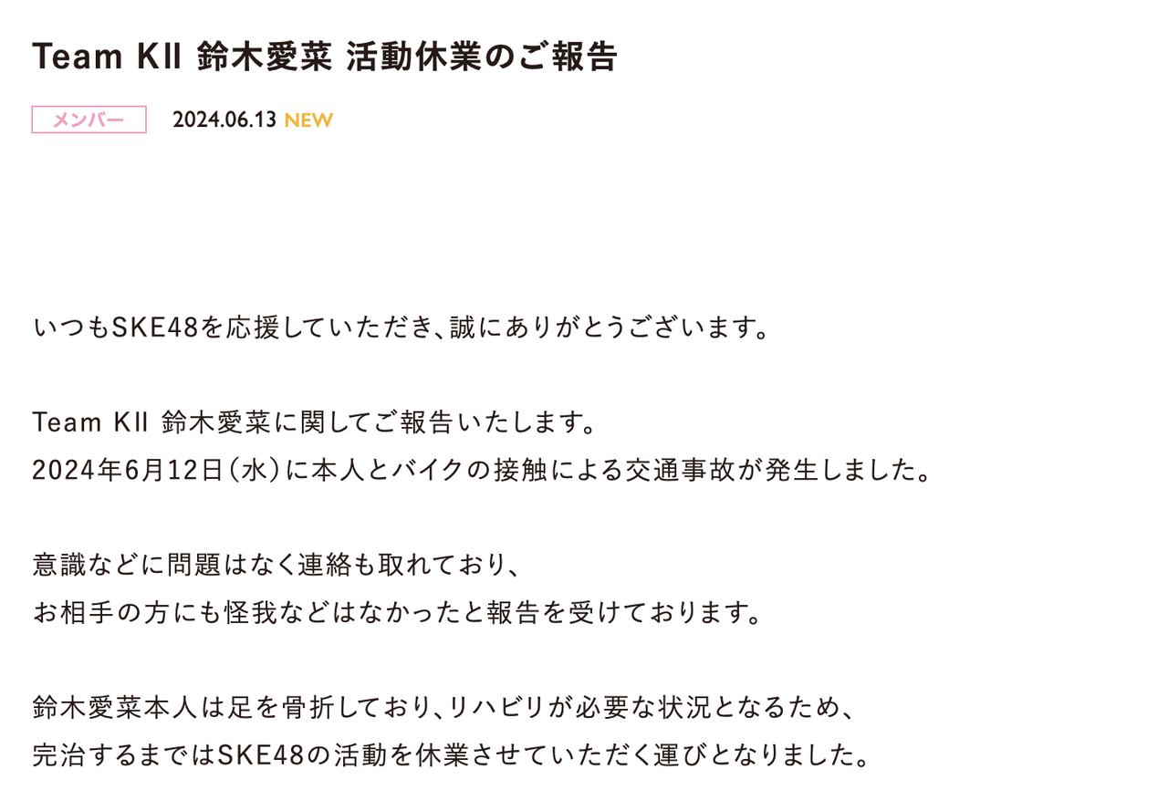 一方の鈴木については重傷だという。「鈴木愛菜本人は足を骨折しており、リハビリが必要な状況となるため、完治するまではSKE48の活動を休業させていただく運びとなりました」と発表した。これに伴い、出演を予定していた劇場公演、夏のツアー、シングル劇場盤特典イベントは全て不参加となる。「楽しみにお待ち頂いていたファンの皆様には誠に申し訳ございませんが、何卒ご理解のほどよろしくお願い申し上げます」と呼びかけた。