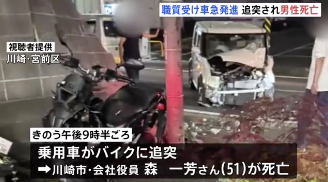 きのう午後9時半ごろ、川崎市宮前区の市道で急発進した乗用車がバイクに追突し、バイクを運転していた川崎市宮前区の会社役員・森一芳さん(51)が全身を強く打って死亡しました。