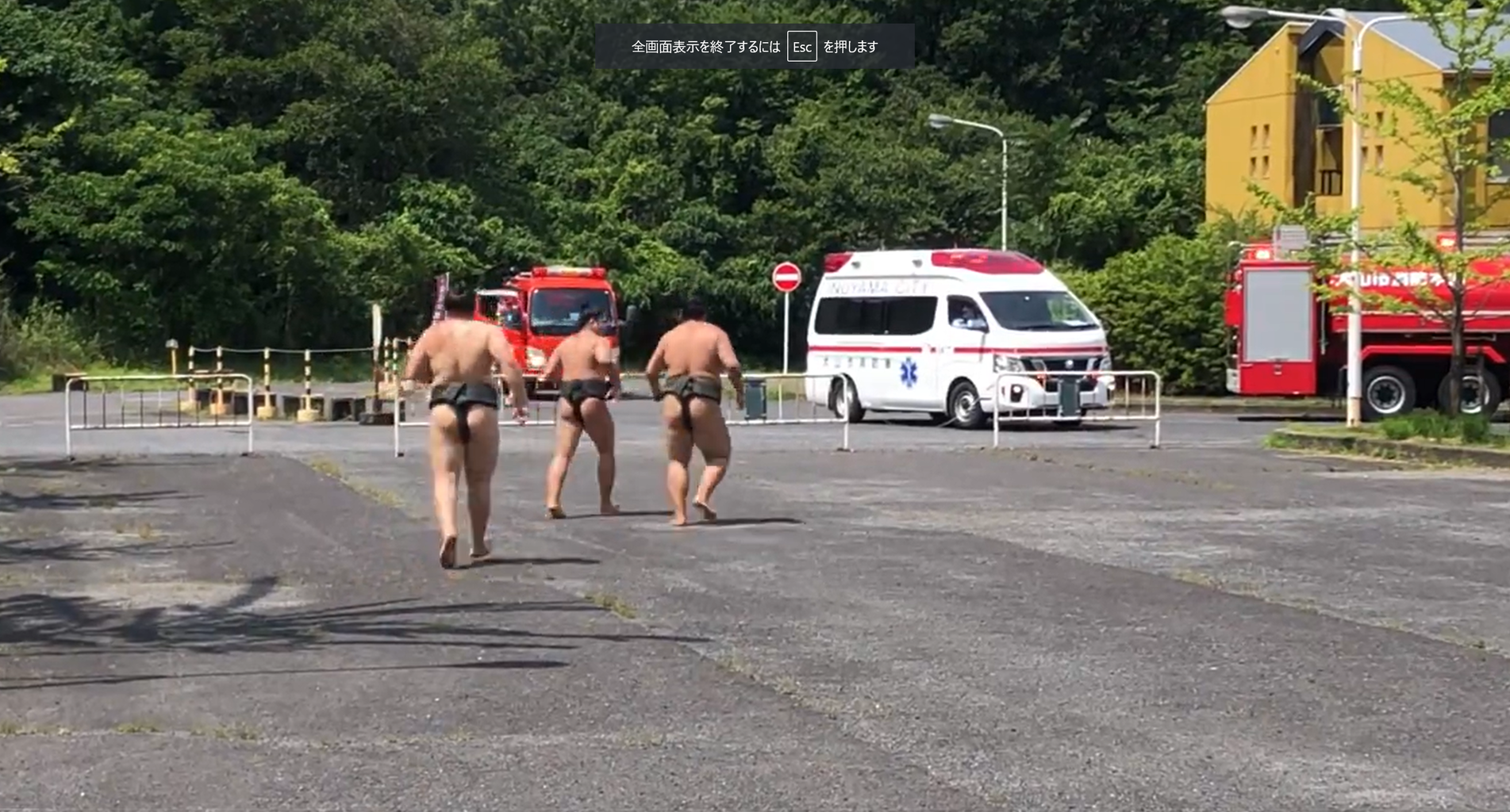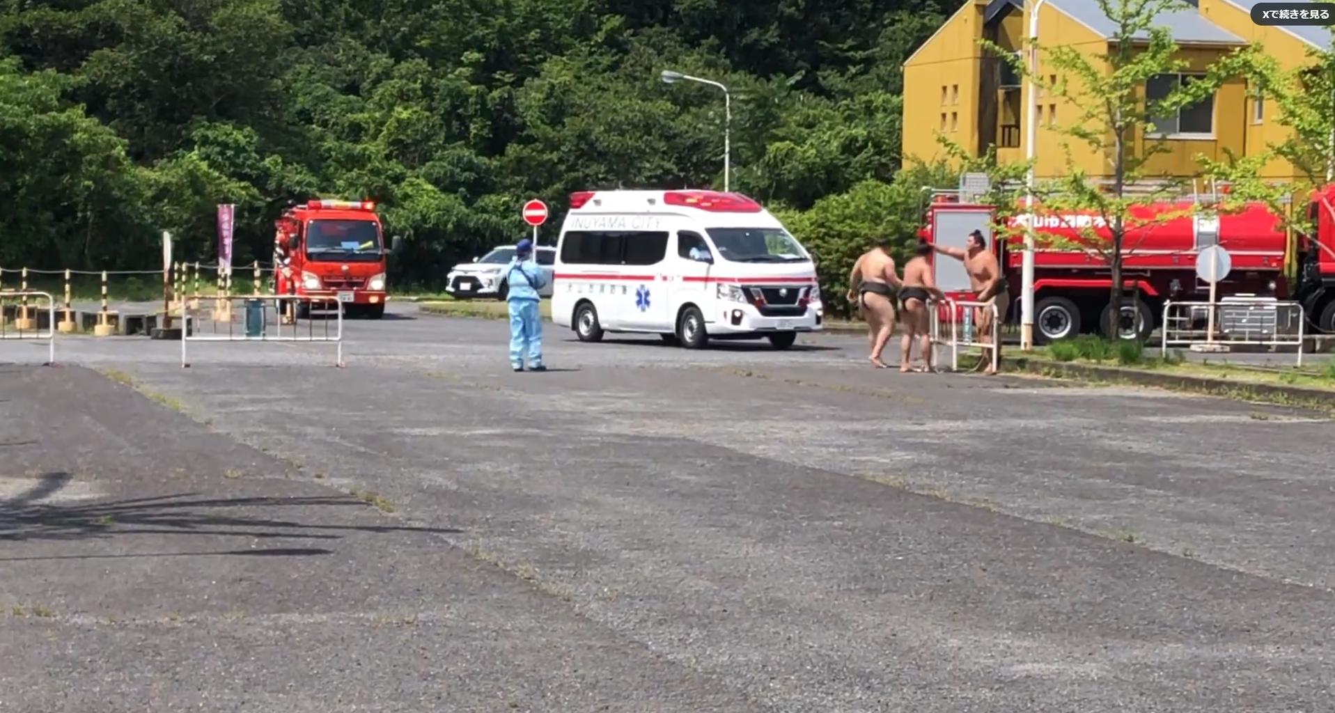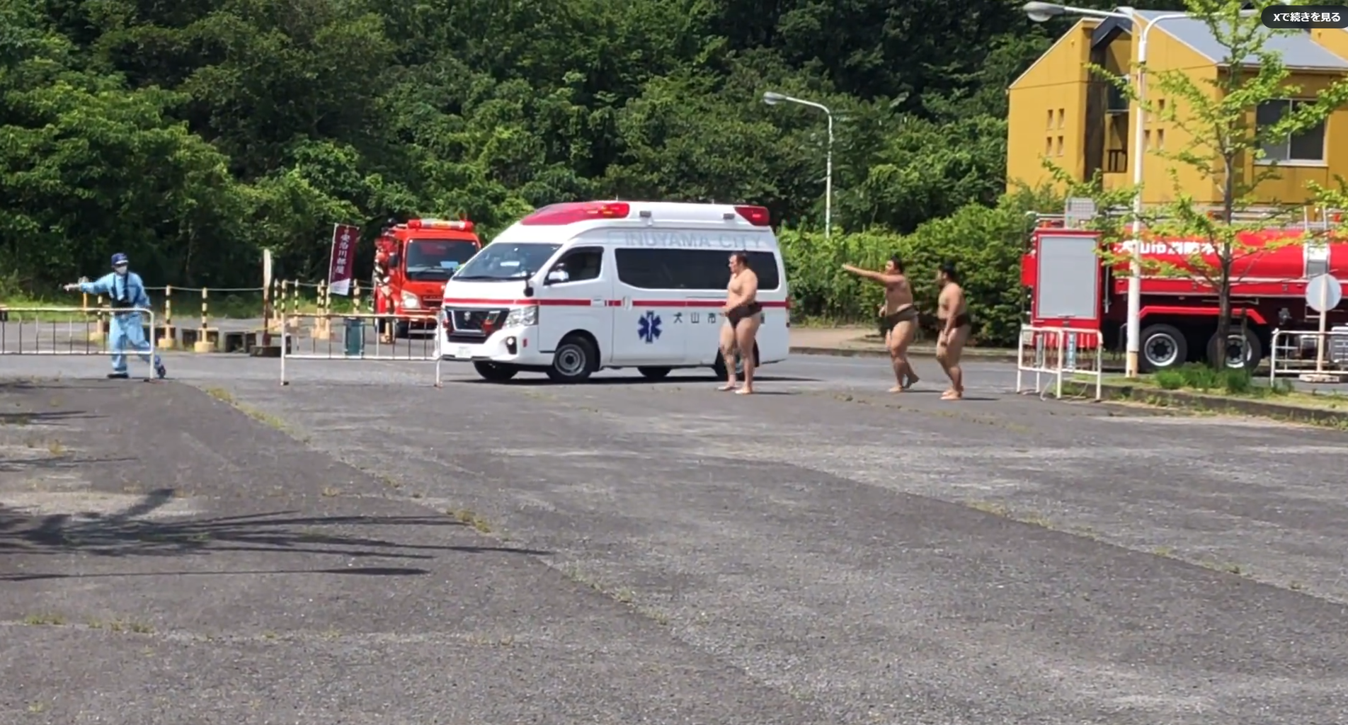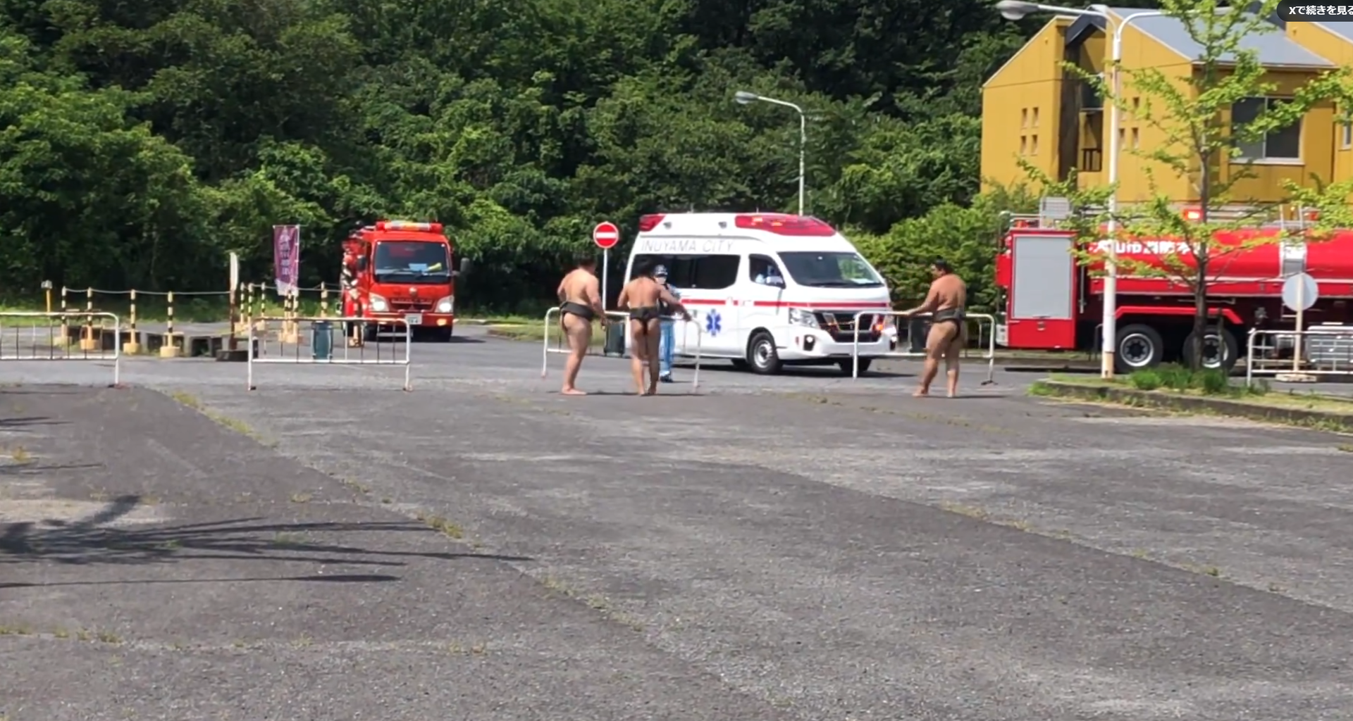 名古屋経済大学構内にて稽古中、ドクターヘリと連携して出動した救急車の侵入を助ける安青錦さん 安強羅さん 安櫻さん
