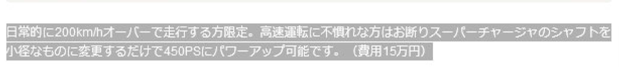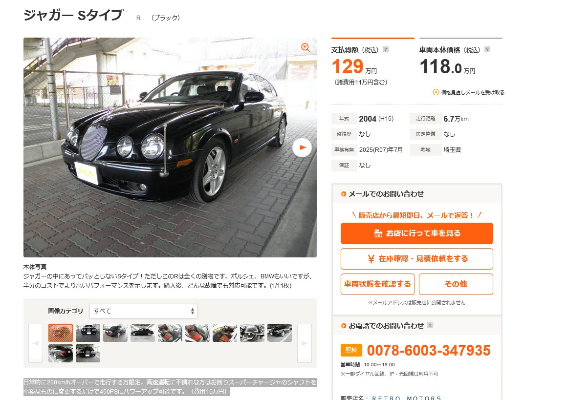 この店のジャガーSタイプRのコメントが「日常的に200km/hオーバーで走行する方限定。高速運転に不慣れな方はお断り スーパーチャージャのシャフトを小径なものに変更するだけで450PSにパワーアップ可能です。(費用15万円)」なの珍走レージングすぎて草 pic.twitter.com/TRYYEz58vv