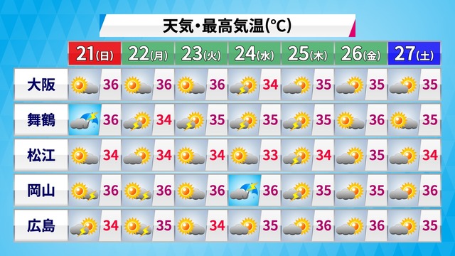 向こう1週間の中国地方と近畿地方は、湿った空気などの影響で局地的に雨や雷雨となる日はあるが、高気圧に覆われておおむね晴れる見込み。また、平年より気温が高く、35℃以上の猛暑日になる所が多くなりそうだ。