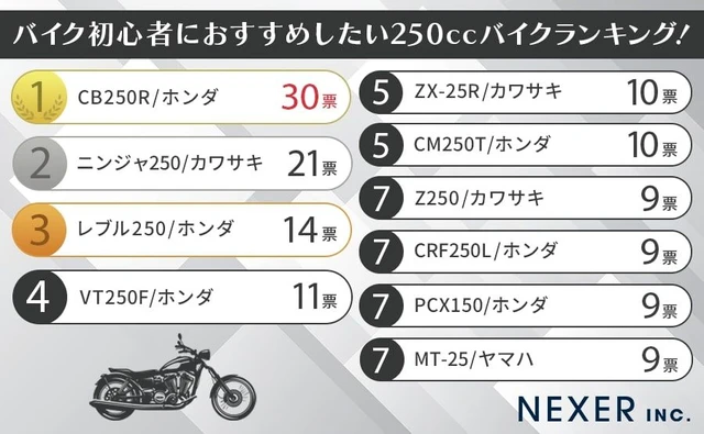 バイク初心者のみなさんのなかには、「どのバイクが良いのか分からない」という人も多いのではないでしょうか。株式会社NEXER(東京都豊島区)とバイク引取りの専門業者「バイクリサイクルジャパン」(京都府木津川市)が共同で実施した「バイク初心者におすすめしたい250ccバイク」に関する調査によると、1位は「CB250R(ホンダ)」となりました。