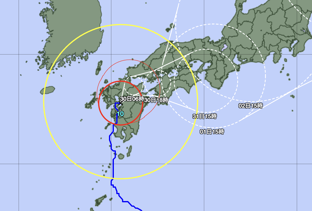 明日30日にかけてゆっくりと九州を縦断。明日30日午後3時の時点で大分市付近を通る予想です。