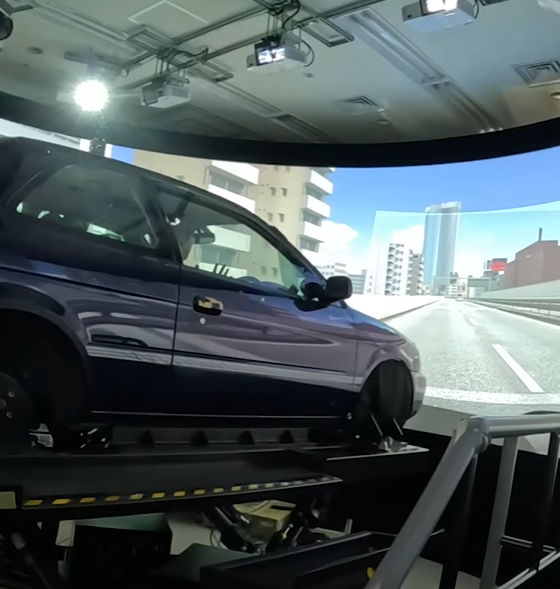 これは、揺れや振動、加速度まで再現できる「6軸ドライビングシミュレータ」。