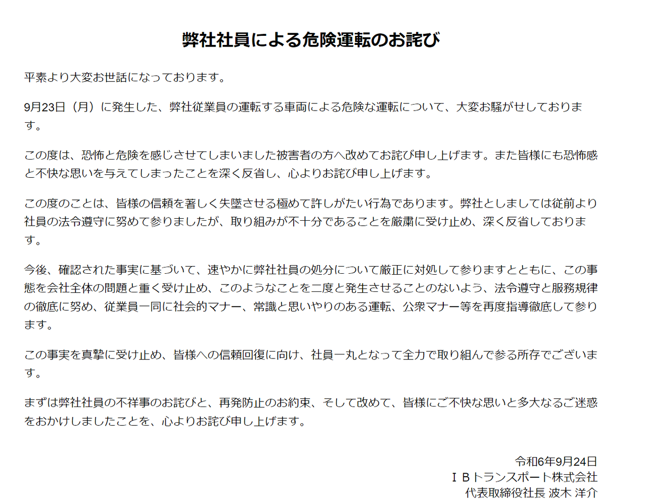 同チャンネルに同社は「弊社社員による危険運転のお詫び」という文書を掲載。「平素より大変お世話になっております。9月23日(月)に発生した、弊社従業員の運転する車両による危険な運転について、大変お騒がせしております。この度は、恐怖と危険を感じさせてしまいました被害者の方へ改めてお詫び申し上げます。また皆様にも恐怖感と不快な思いを与えてしまったことを深く反省し、心よりお詫び申し上げます。この度のことは、皆様の信頼を著しく失墜させる極めて許しがたい行為であります。弊社としましては従前より社員の法令遵守に努めて参りましたが、取り組みが不十分であることを厳粛に受け止め、深く反省しております」とした。