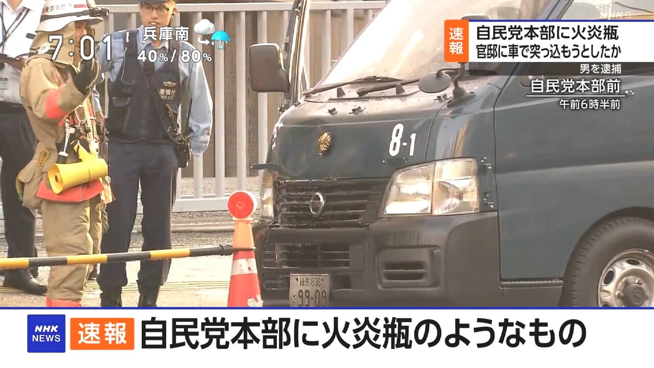 捜査関係者によると、19日早朝、何者かが東京都千代田区の自民党本部に火炎瓶を投げ込み、その後、首相官邸に車両で突入しようとしたとの情報があった。突入しようとしたのは男で、警視庁に確保されたという。詳しい状況を調べている。
