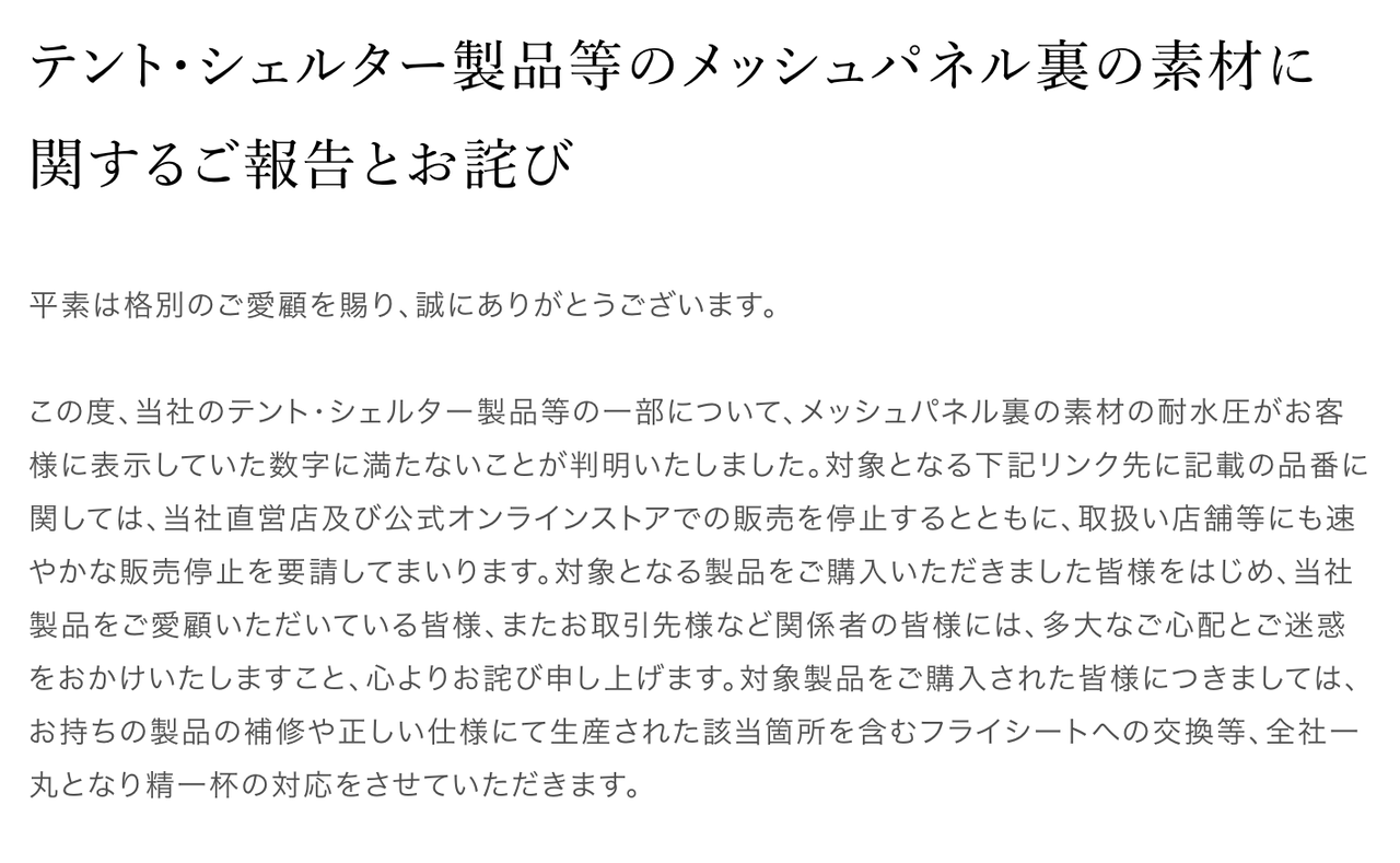 「テント・シェルター製品等のメッシュパネル裏の素材に関するご報告とお詫び」と題した文章をアップ。「この度、当社のテント・シェルター製品等の一部について、メッシュパネル裏の素材の耐水圧がお客様に表示していた数字に満たないことが判明いたしました」と報告。対象となった45商品の品番を記載したリンク先を掲載し、「当社直営店及び公式オンラインストアでの販売を停止するとともに、取扱い店舗等にも速やかな販売停止を要請してまいります」と販売停止を発表。「対象となる製品をご購入いただきました皆様をはじめ、当社製品をご愛顧いただいている皆様、またお取引先様など関係者の皆様には、多大なご心配とご迷惑をおかけいたしますこと、心よりお詫び申し上げます。対象製品をご購入された皆様につきましては、お持ちの製品の補修や正しい仕様にて生産された該当箇所を含むフライシートへの交換等、全社一丸となり精一杯の対応をさせていただきます」と謝罪した。