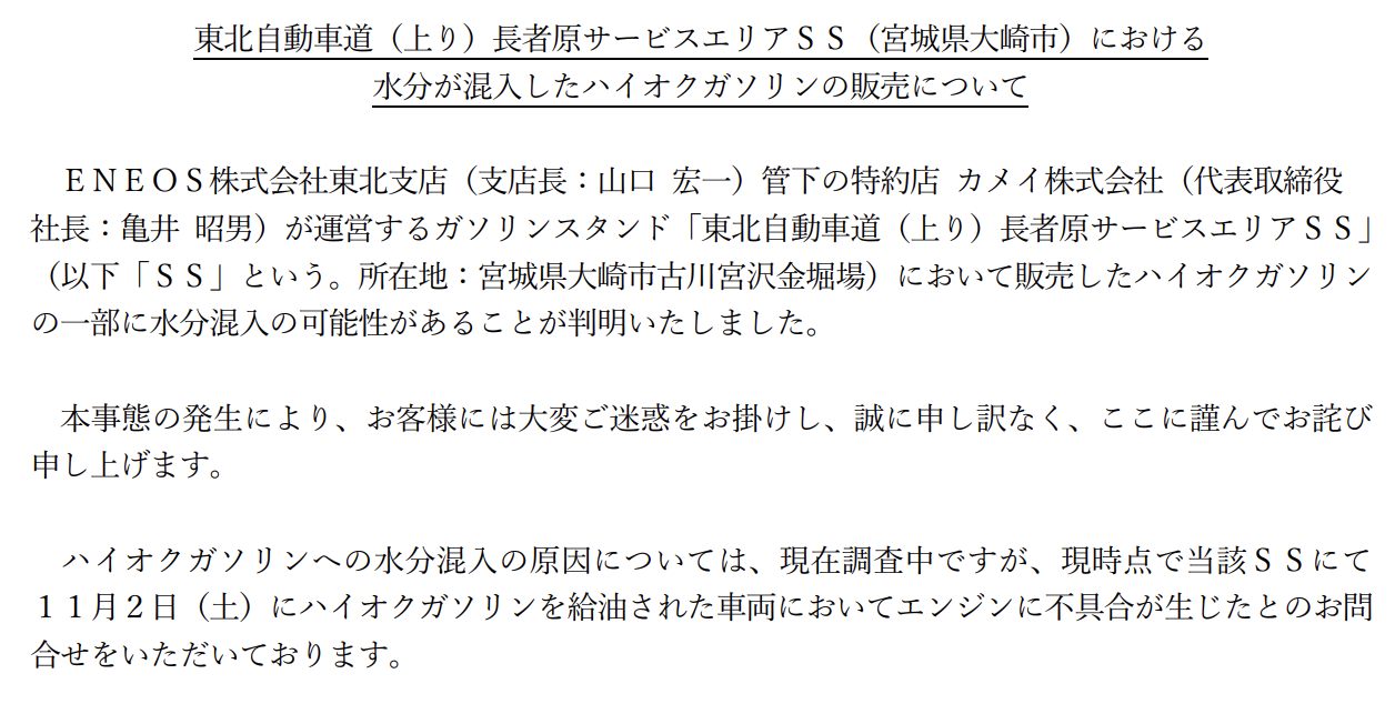 石油元売り大手ENEOS(エネオス)とカメイは7日、東北自動車道上り線のガソリンスタンド「長者原サービスエリアSS」で、今月2日に販売したハイオクガソリンに水分が混入していたと発表した。エンジンに不具合が生じたという情報が、利用客から少なくとも3件寄せられた。けが人は確認されていない。
