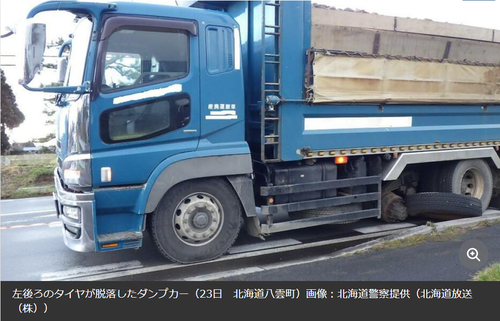 23日午後、北海道八雲町の国道5号線を走行していたダンプから左後ろのタイヤ2本が外れました。このタイヤに巻き込まれた人や車はなく、けが人はいません。23日午後3時15分ごろ、八雲町の国道5号線を走行していたダンプカーの運転手から「走っていてタイヤがはずれました」と110番通報がありました。