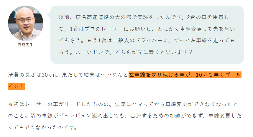 以前、東名高速道路の大渋滞で実験をしたんです。2台の車を用意して、1台はプロのレーサーにお願いし、とにかく車線変更して先を急いでもらう。もう1台は一般人のドライバーに、ずっと左車線を走ってもらう。よーいドンで、どちらが先に着くと思います?渋滞の長さは30km。果たして結果は……なんと左車線を走り続ける車が、10分も早くゴールイン!
