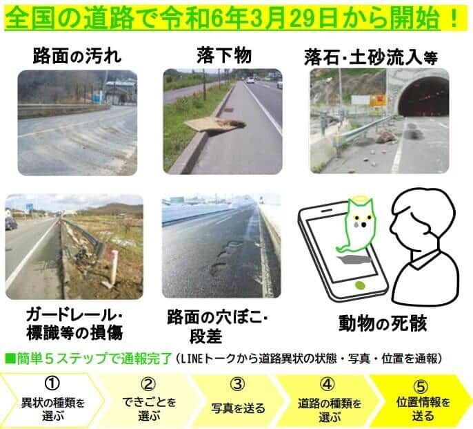 「#9910」(全国共通)に電話すると利用でき、24年3月29日からは全国の道路異状をLINEで通報できるようになった。