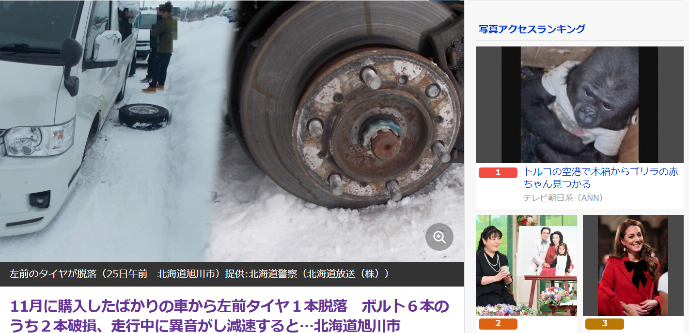 この乗用車は、11月に購入したもので、その際、今回外れたタイヤが装着されていました。