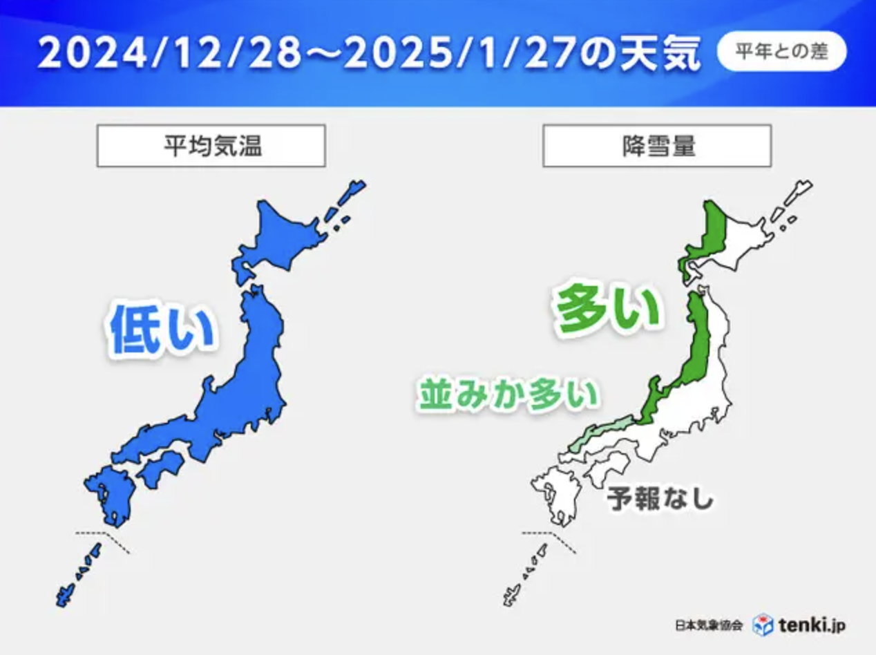 この先1か月は、冬型の気圧配置が強まりやすく、日本海側は平年に比べて、雪や雨の降る日が多いでしょう。一方、太平洋側は平年に比べて晴れる日が多い見込みです。