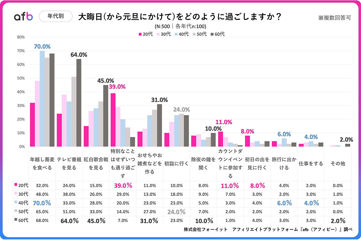また、20代は「特別なことはせずいつも通り過ごす」と回答した方が39%と全年代で最も多くなりました。昔は大晦日や元旦は商業施設・飲食店などは休業することが一般的で、家庭で過ごす時間が中心でしたが、現代では多くの商業施設が通常通り営業しており、買い物や外出を楽しむ人も増えています。また、デジタルコンテンツの普及などその他の娯楽も多様化しているため、大晦日を特別なイベントと捉えていない方が多くなったのかもしれません。