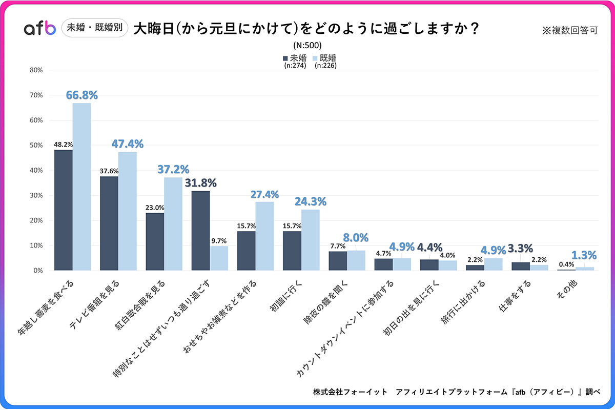 未婚・既婚別で見ると、最も差が大きかった項目は「年越し蕎麦を食べる」で既婚の方の回答が約20%高くなっており、家族で年越し蕎麦を食べる方が多いことが伺えます。また、それ以外でも「紅白歌合戦を見る」や「初詣に行く」など特別な大晦日の過ごし方をするのは既婚の方が多くなっています。家族と一緒に過ごしながらその1年を振り返ったり、元旦には新たな目標を共有したりと、家族との絆を深める機会になっている様子が伺えました。