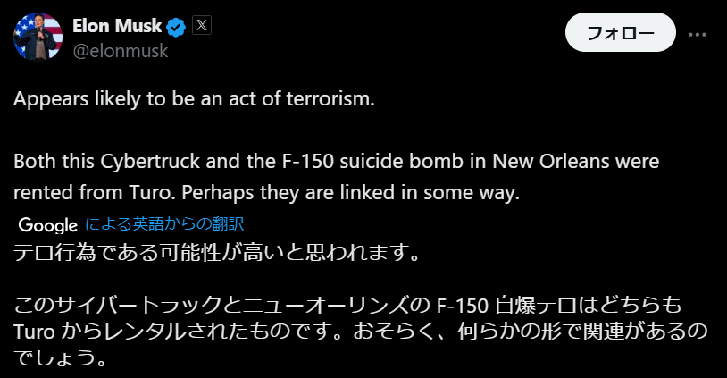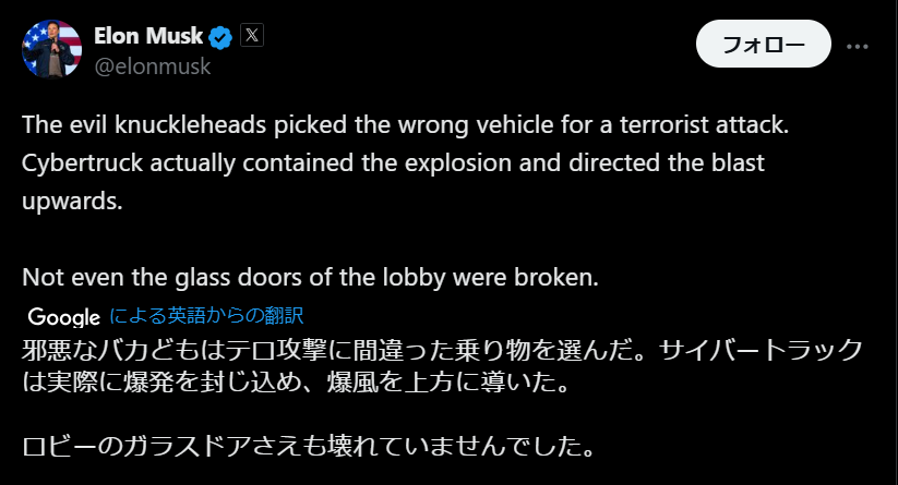 テスラ「サイバートラック」が爆発・炎上、トランプ次期大統領が所有するトランプ・インターナショナル・ホテル