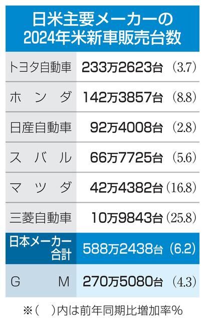 日本の自動車メーカー6社が3日発表した2024年の米新車販売台数は前年比6.2%増の588万2438台だった。半導体不足といった新車の供給制約からの回復と、HVを中心に旺盛な米国の新車需要に支えられ、全社が前年を上回った。