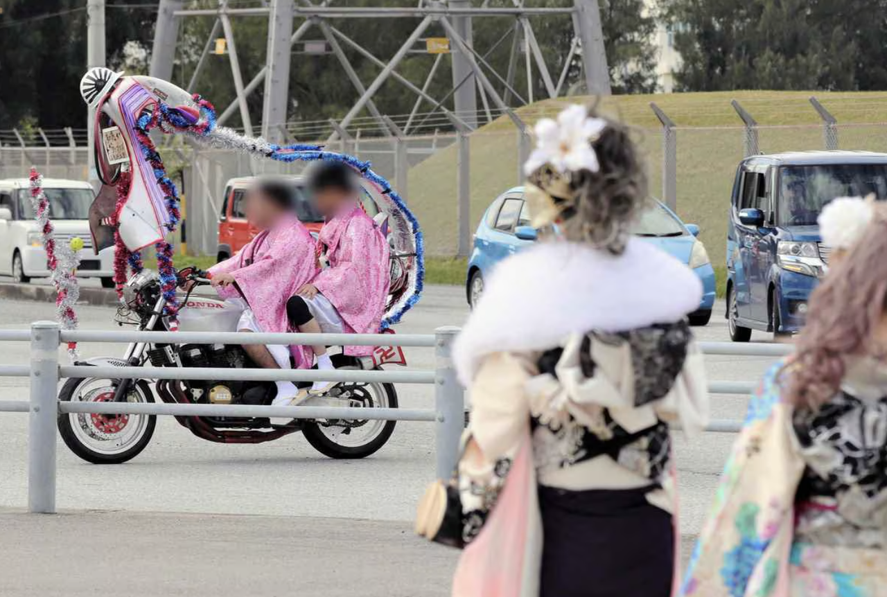 沖縄市の式典会場はバスケットボールの聖地といわれる「沖縄アリーナ」。午後1時15分ごろ、華やかな振り袖や羽織袴(はかま)に身を包んだ若者が一斉に振り返った。視線の先は車線をまたいで蛇行する2人乗りの改造バイク。派手な装飾を施した車も続いた。