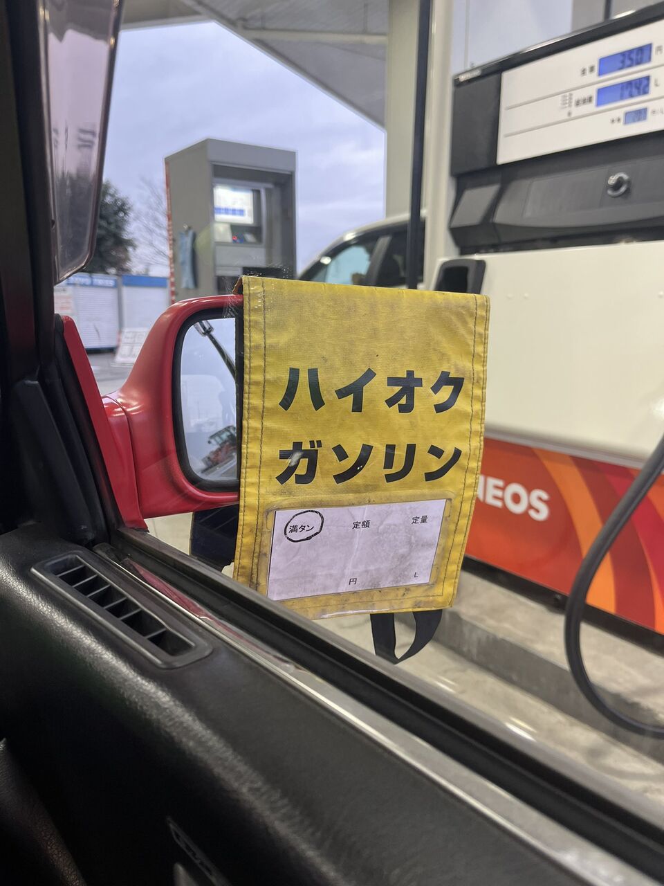 ミラー引っ掛けるのは「まだ給油中ですよ」のサインです。