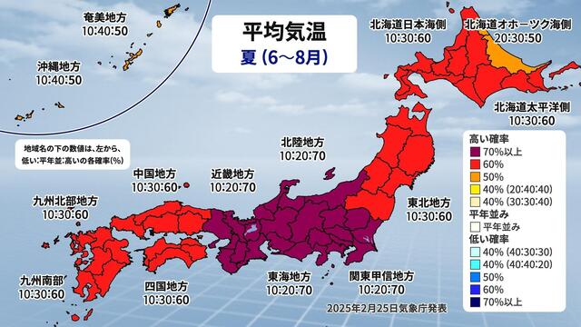 気象庁は25日(火)、夏(6月~8月)の天候の見通しを発表した。暖かい空気に覆われやすいため、気温は全国的に高くなる見込み。夏(6月~8月)の降水量は、全国的に平年並みとなりそうだ。