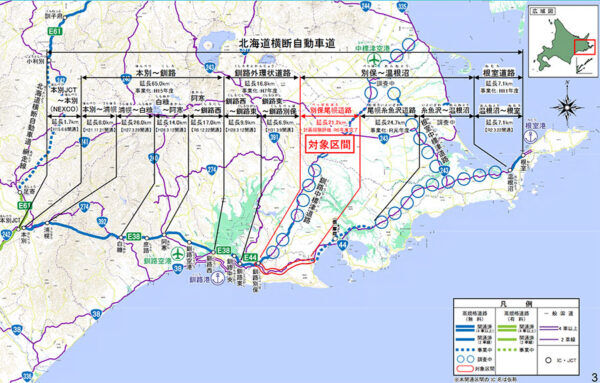 国土交通省北海道開発局は2025年3月10日、社会資本整備審議会 道路分科会の第38回北海道地方小委員会を開催。2025年度に事業化を予定している北海道横断自動車道「別保尾幌道路」の新規事業採択評価を行いました。この道路は、2024年12月に道央道(千歳恵庭JCT)と1本につながった道東道の釧路別保IC(釧路町)から東の厚岸町尾幌に至る約21.2km。すでに事業化されている「尾幌糸魚沢道路」(厚岸町内24.7km)との間をつなぐ区間となります。