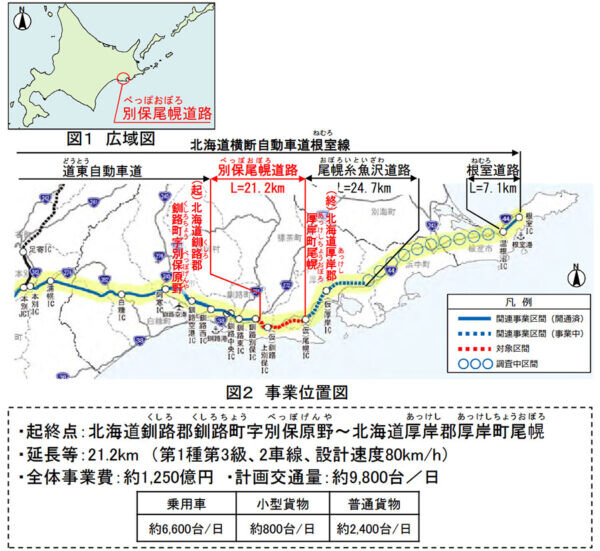 この道路は、2024年12月に道央道(千歳恵庭JCT)と1本につながった道東道の釧路別保IC(釧路町)から東の厚岸町尾幌に至る約21.2km。すでに事業化されている「尾幌糸魚沢道路」(厚岸町内24.7km)との間をつなぐ区間となります。