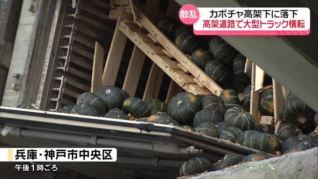 警察によりますと、高架道路を神戸空港方面に走っていた大型トラックがカーブで横転。積み荷のカボチャが高架下の道路に落下し、散らばったということです。