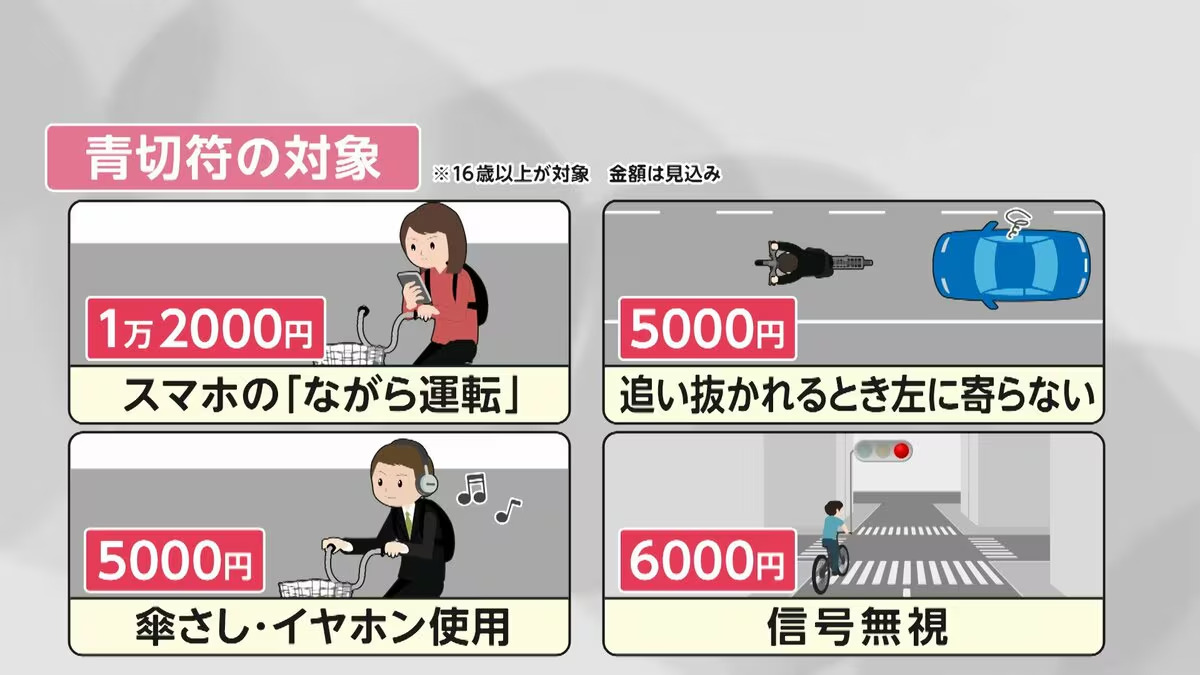 これまで自転車違反の多くは交通ルールについて指導を受ける「警告」にとどまり、事故につながる悪質な運転などは刑事処分が問われる「赤切符」の対象で、反則金を科す「青切符」の導入は初めてです。