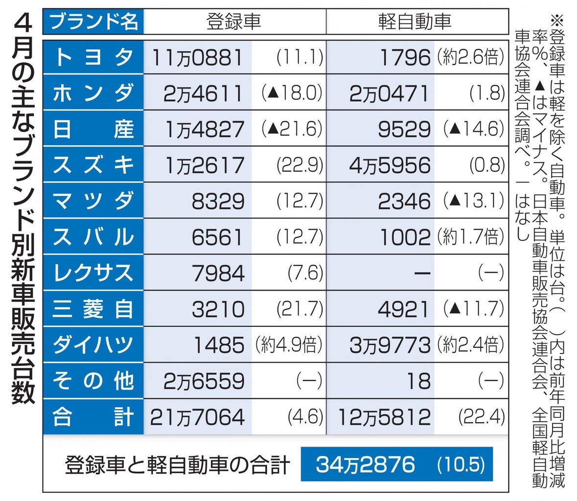 4月の国内新車販売台数は前年同月比10.5%増の34万2876台だった。増加は4カ月連続。日本自動車販売協会連合会と全国軽自動車協会連合会が1日発表した。認証不正問題でダイハツ工業の販売が落ち込んだ前年の反動で増えた。