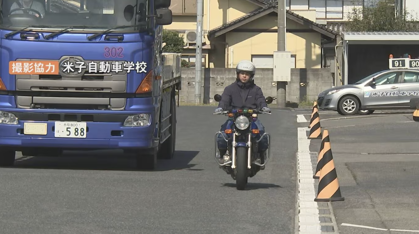 確かに、追い越しと言えば右側からするもの。米子自動車学校(鳥取県・米子市)に撮影の協力をしていただき、トラックの左側をバイクが走行する状況を再現しました。